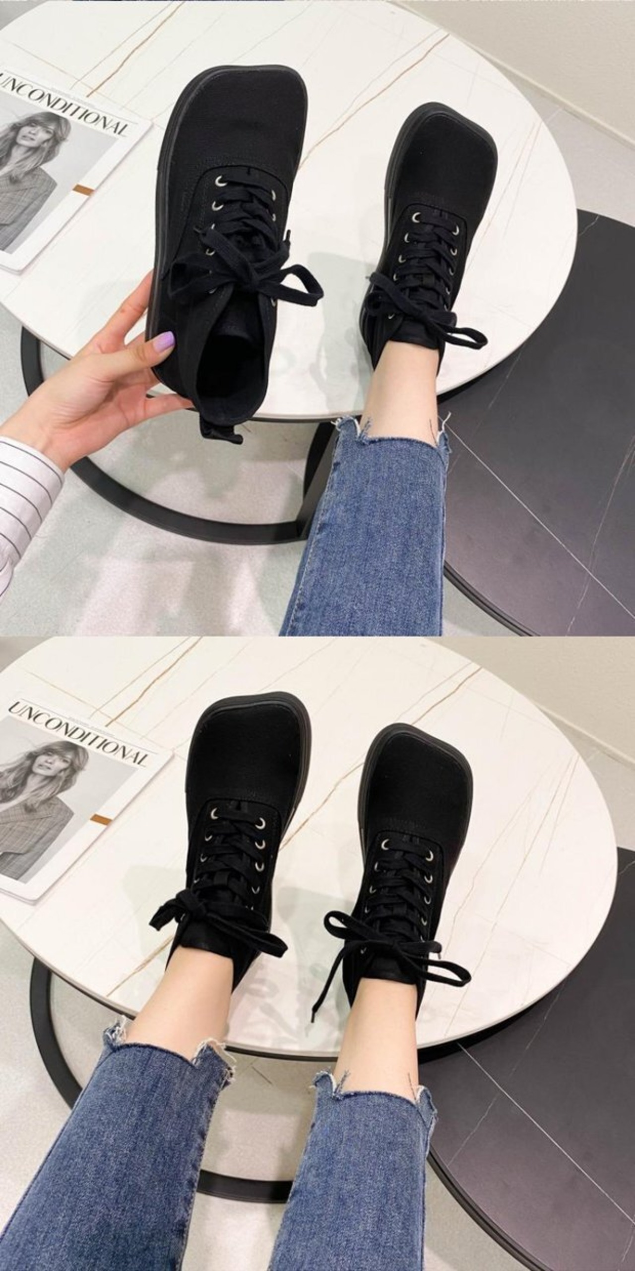 リトルブラックシューズ女性バージョン2020秋新しいハイトップレースアップ醜いキャンバスシューズ女性の四角いつま先プラットフォームプラットフォーム学生靴 オータム 秋物 スクウェア インポートシューズ mi626867938872