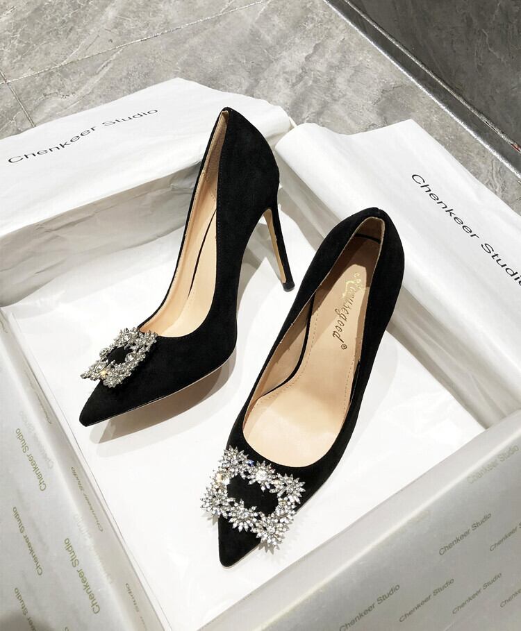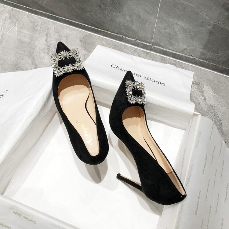 オータムウィンターラインストーンバックルハイヒールスウェード 靴 シューズ パンプス 秋物 冬物 スクウェア ヨーロピアン 3/14 春夏 SS mi6236519506838
