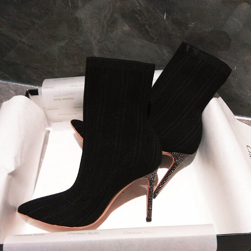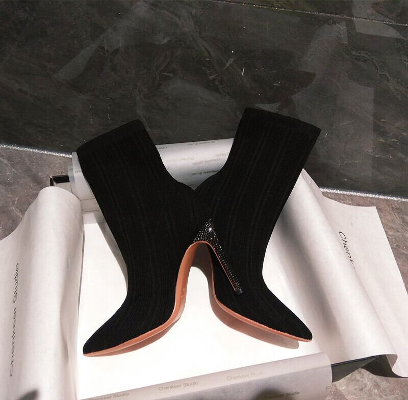 ハイヒールニットストレッチブーツショートラインストーンスキニーシングルブラック 靴 シューズ エラスティック 伸縮 3/14 春夏 SS mi6274602630768