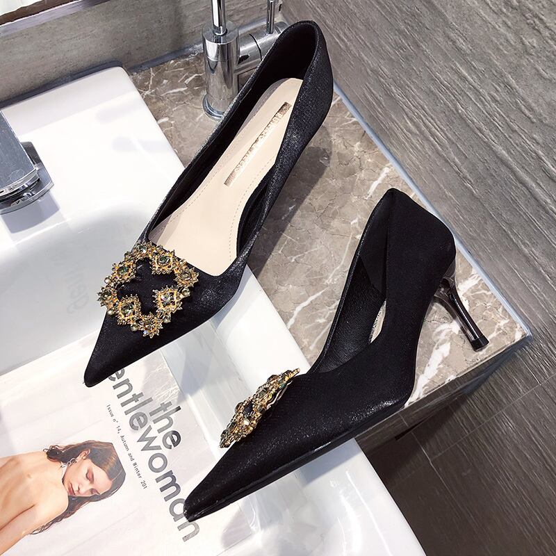 ラインストーンバックルサテンレザーヒールスプリングオータムシングル 靴 シューズ ハイヒール 春物 秋物 スクウェア 3/14 春夏 SS mi6215914792741